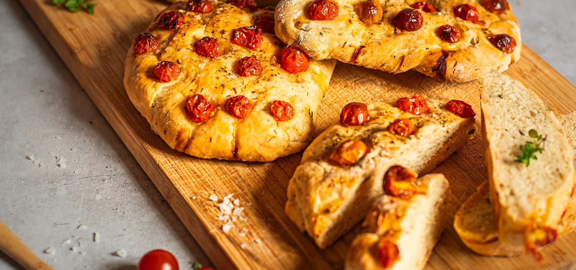 Focaccia ist ein italienischer Hefeteigfladen, der seinen Ursprung in Ligurien hat. Das Besondere: Der Teig wird vor dem Backen mit Olivenöl, Salz, Kräutern oder Gemüse belegt. Typisch sind auch die kleinen Mulden, die mit den Fingern in den Teig gedrückt werden – so kann das Öl wunderbar einziehen und sorgt für außen krosse, innen weiche Fladen.